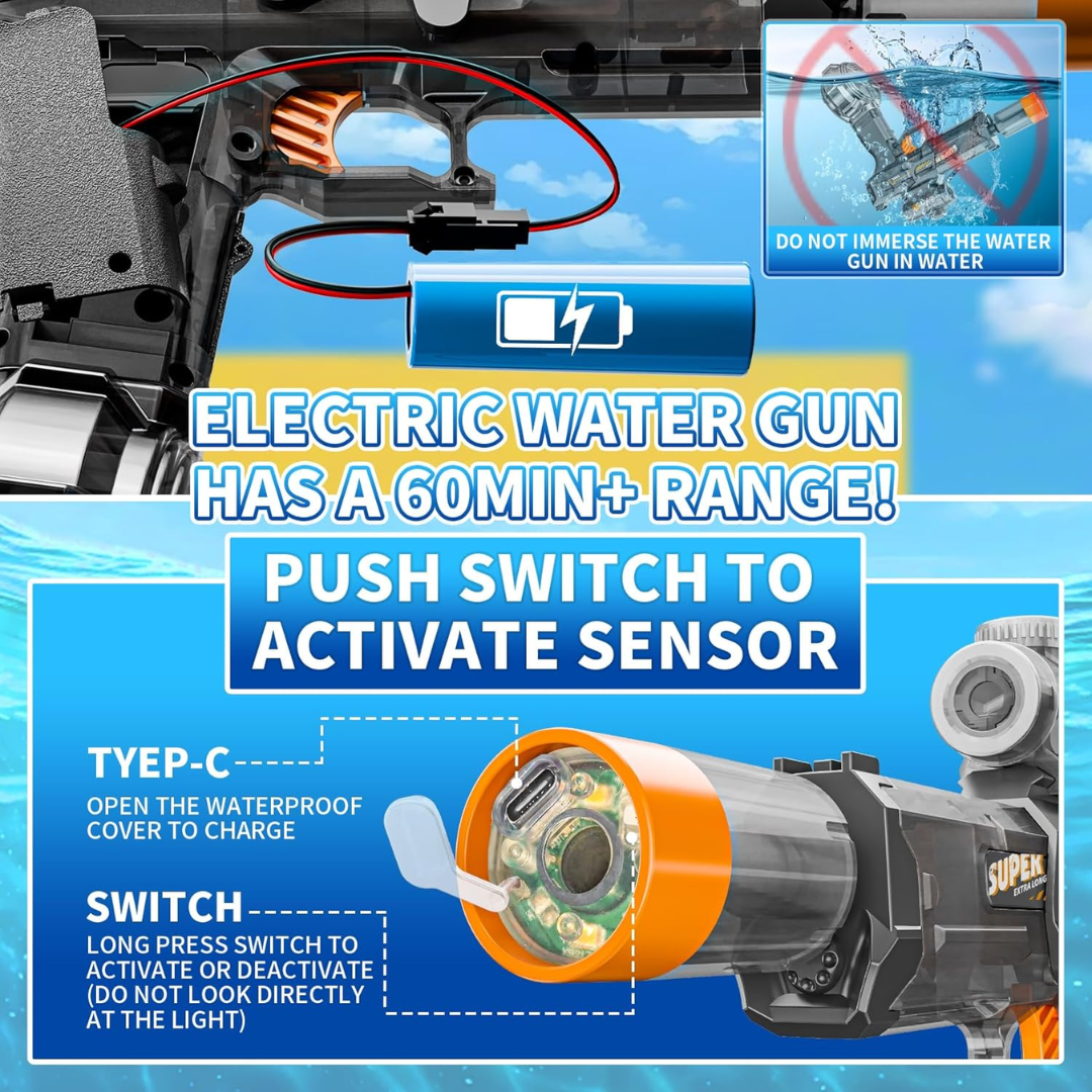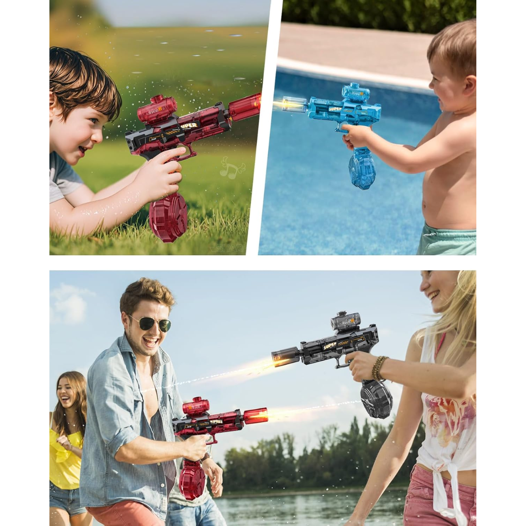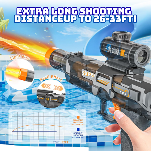 Experience epic splash battles with lights, recoil effects, and a powerful water blast reaching up to 10 meters (33 ft). Perfect for summer fun without manual pumping.